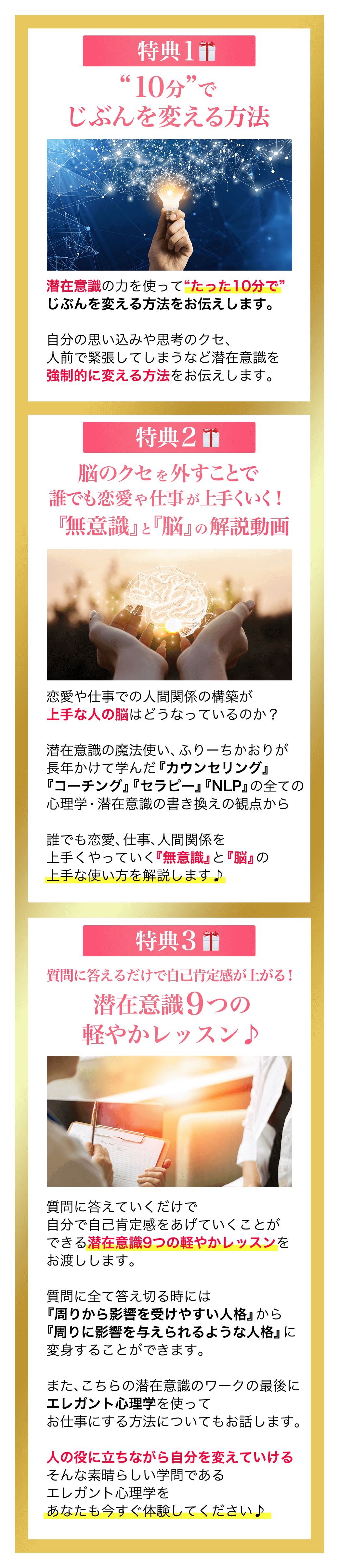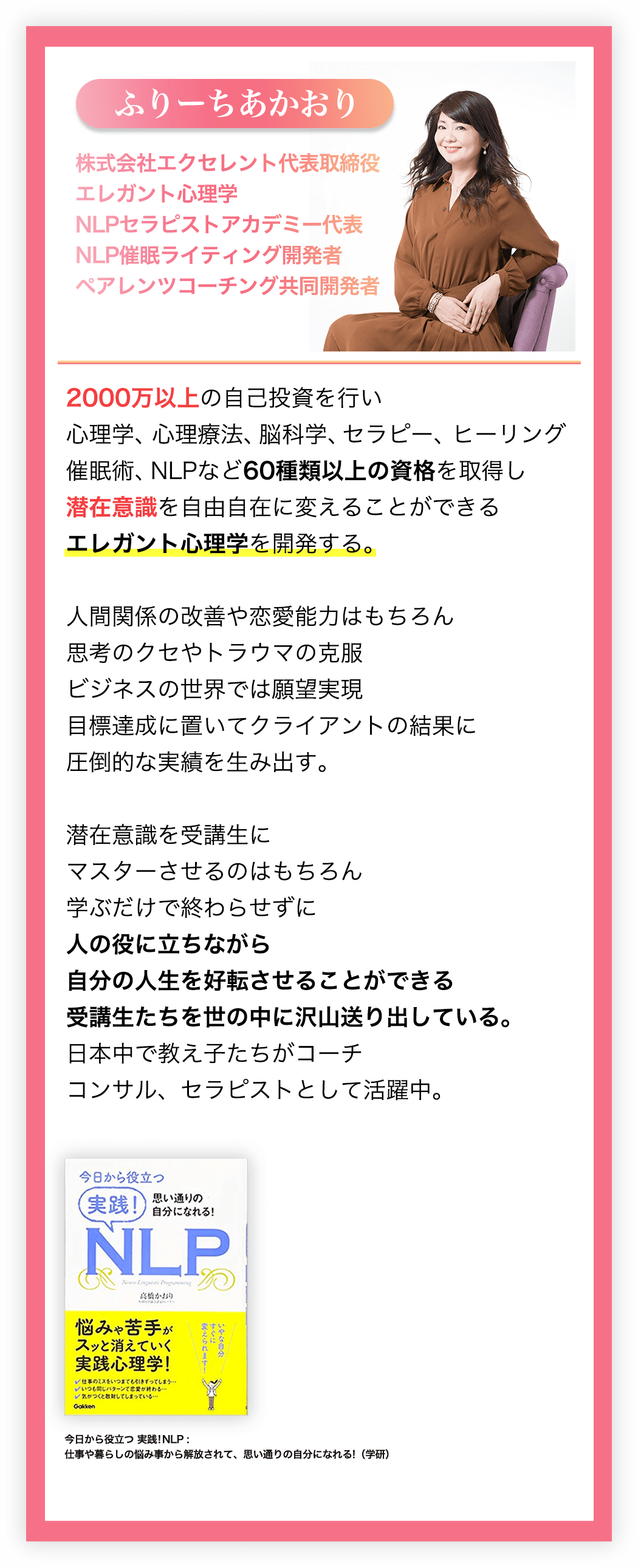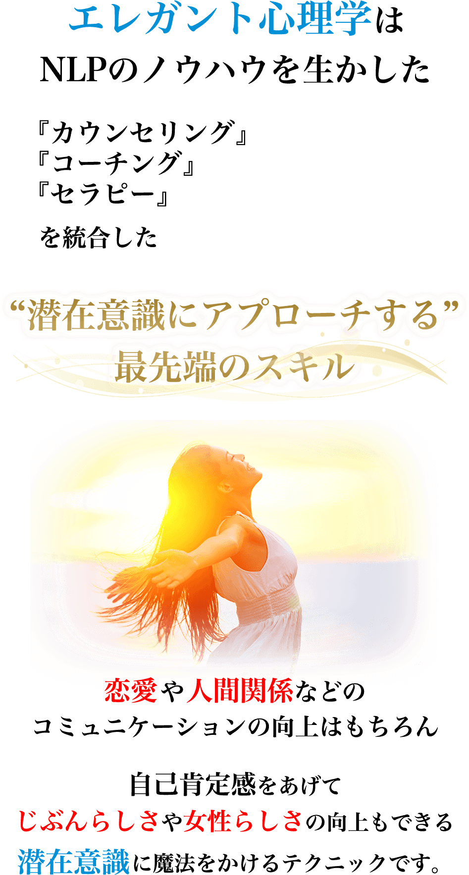 エレガント心理学では、3つの質問をしただけで人生を大きく変化された方がいたり、エレガント心理学のNLPを使ったセッションを実践したことでクライアント様を大きく変化させることができたことはもちろん、新しいクライアント様方とのご縁も大きく広げることができました。