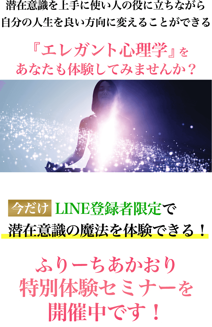 エレガント心理学では、理論的に無意識に語りかけて願望実現ができるようになります。もし、悩まれているなら是非飛び込んでください。どんどん願いを叶えられるのでオススメします。