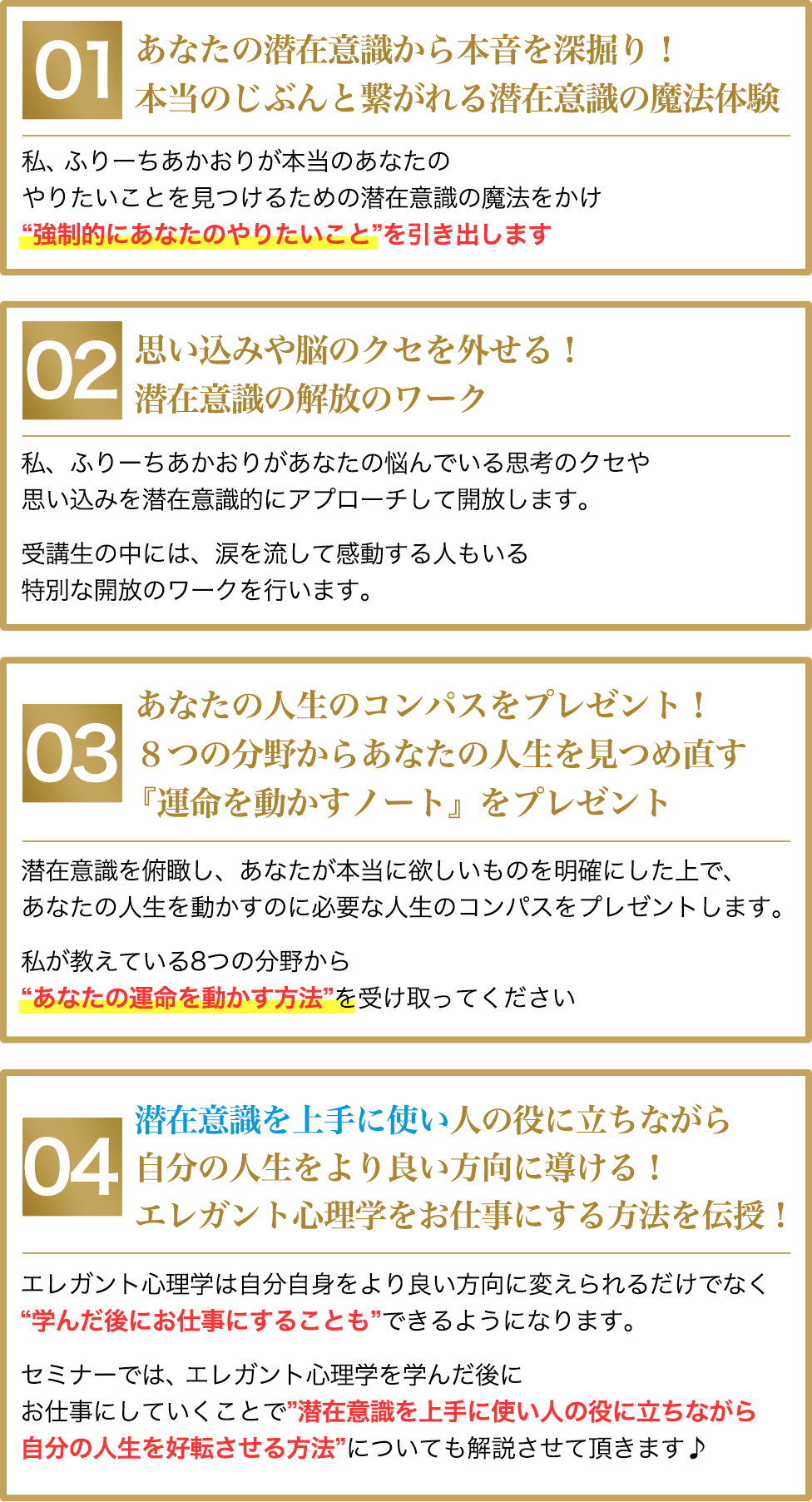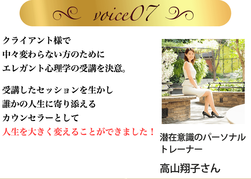 エレガント心理学の『人の役に立ちながら自分を変えることができる』という考え方、潜在意識へのアプローチ方法のおかげで自分が望む人生を歩むことができていてとても満足しています。