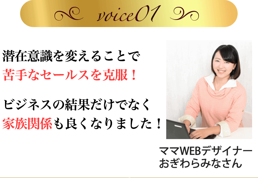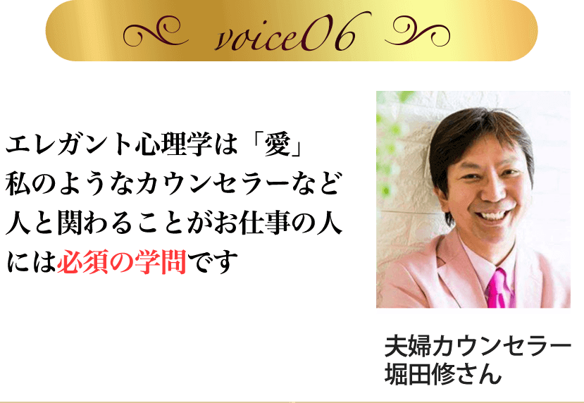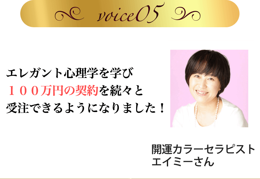 エレガント心理学を学ぶ前の私は、自分の我を出してしまい、お客さんの声に耳を傾けることができていませんでした。ですが講座でクライアントのタイプに合わせた接し方を学んだことで、楽に仕事ができるようになり継続コースの申し込みを頂けるようになりました。