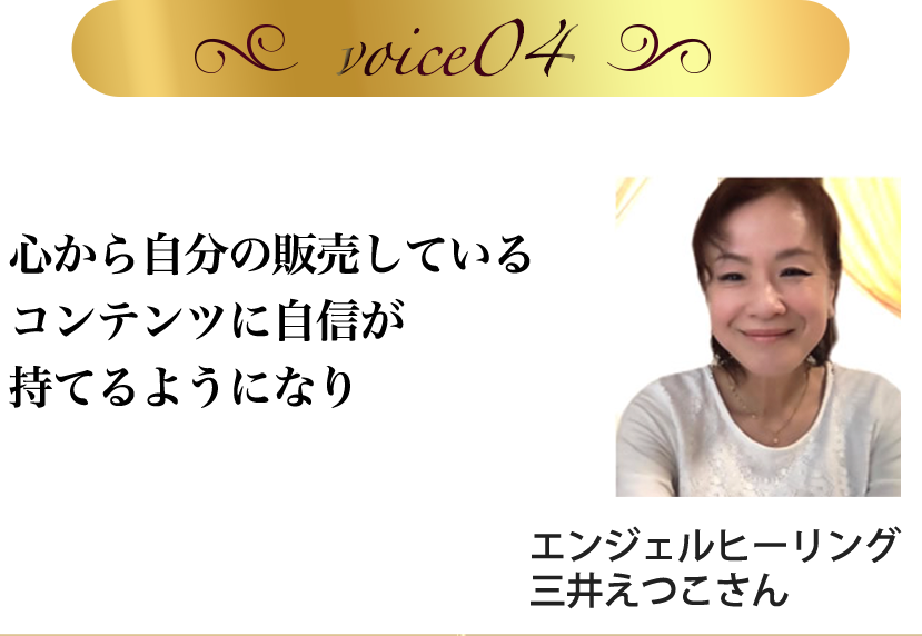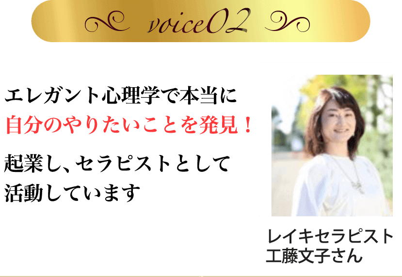 自分の商品をどう売れば良いかずっと分からずにモヤモヤしている時に、エレガント心理学に出会いました。エレガント心理学に出会ってから自分のやりたいことが明確になり、夫との関係性も改善。ビジネスも応援してくれるようになりました。