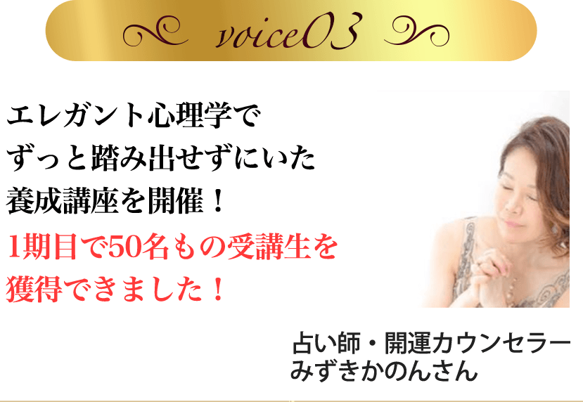 エレガント心理学を受講して、自分自身と向き合うことで本当に自分がやりたかった養成講座を始める勇気が持てたのと、実際に人に伝えるスキルも学ぶことができたので始めることを決意。
