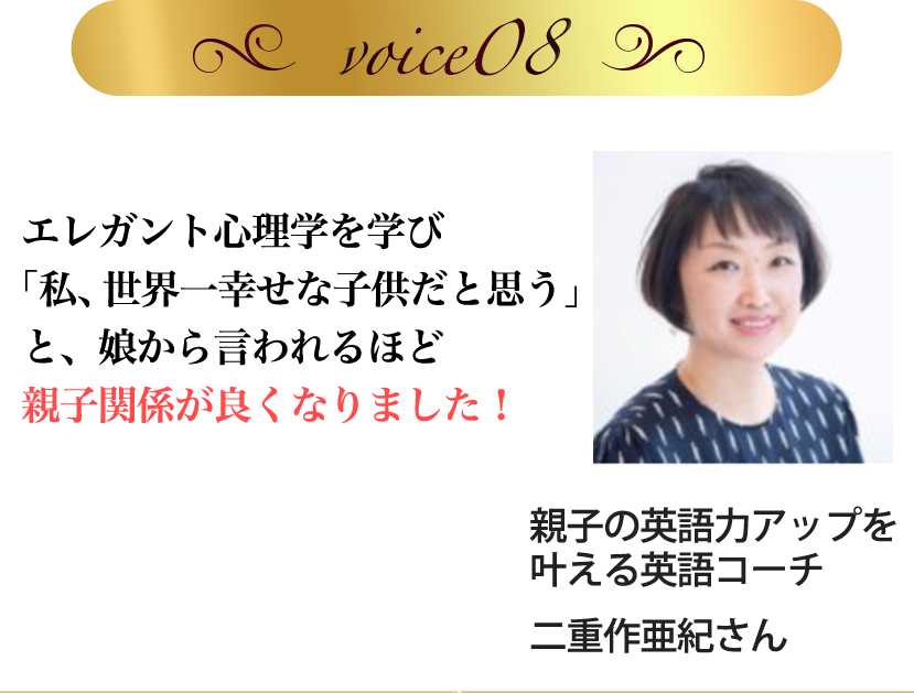 今では、エレガント心理学の教えを娘にも伝えたことで「私、世界一幸せな子供だと思う」と言って貰え、母親としてもすごく幸せな日々を送れています。